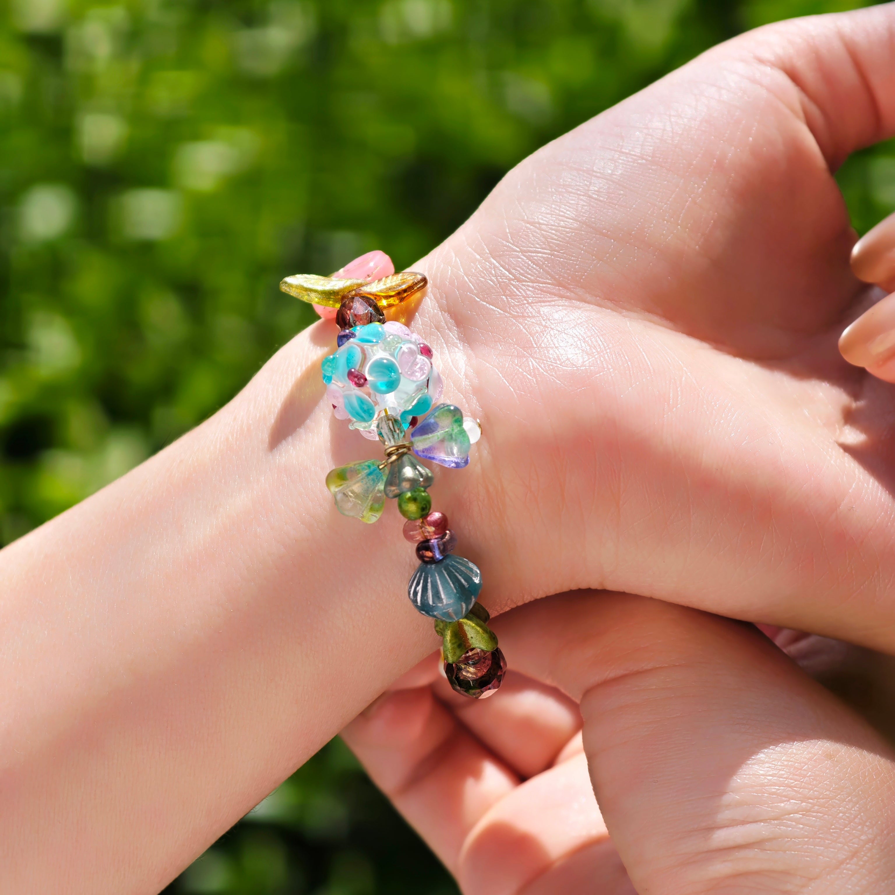 A breeze of color, a memory of bloom—this bracelet captures the quiet poetry of summer woods. The centerpiece, a glass bead sculpted like a blooming blue hydrangea, is framed by leaves, flowers, seashells, and fruit-shaped beads in translucent hues.