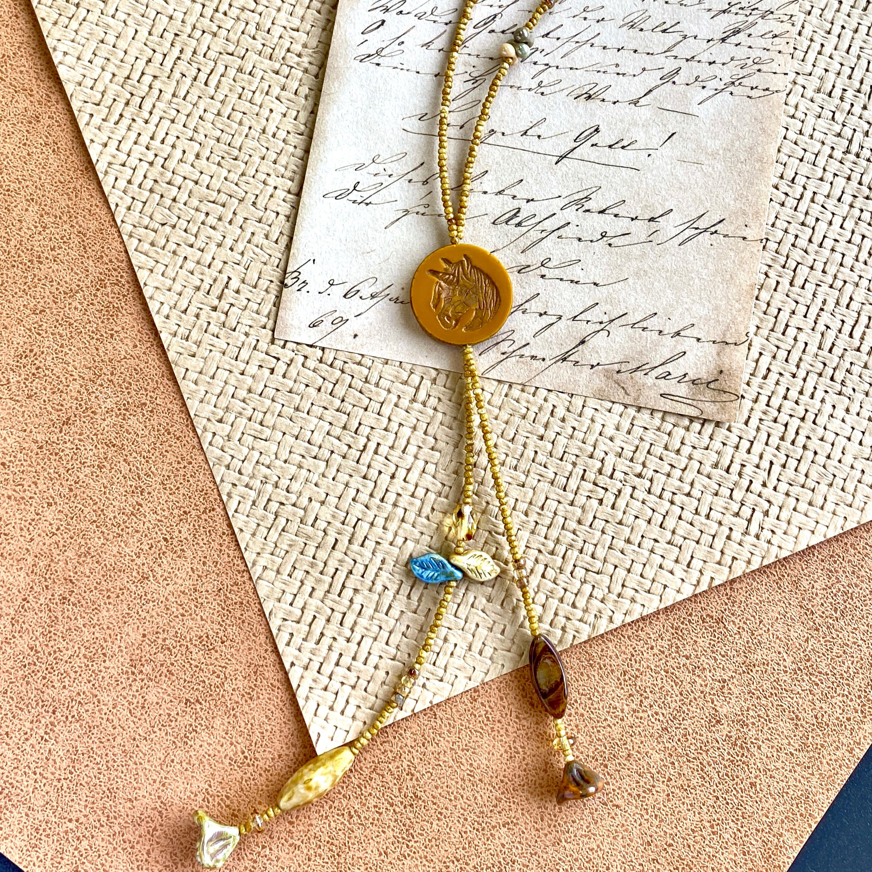 This necklace features a golden unicorn pressed into an old-coin-style pendant, strung on glass beads in soft yellows, cloudy blue, honey brown, and pale ivory. Every detail feels like it came from a forgotten storybook — the kind you’d find in an attic wrapped in ribbon.