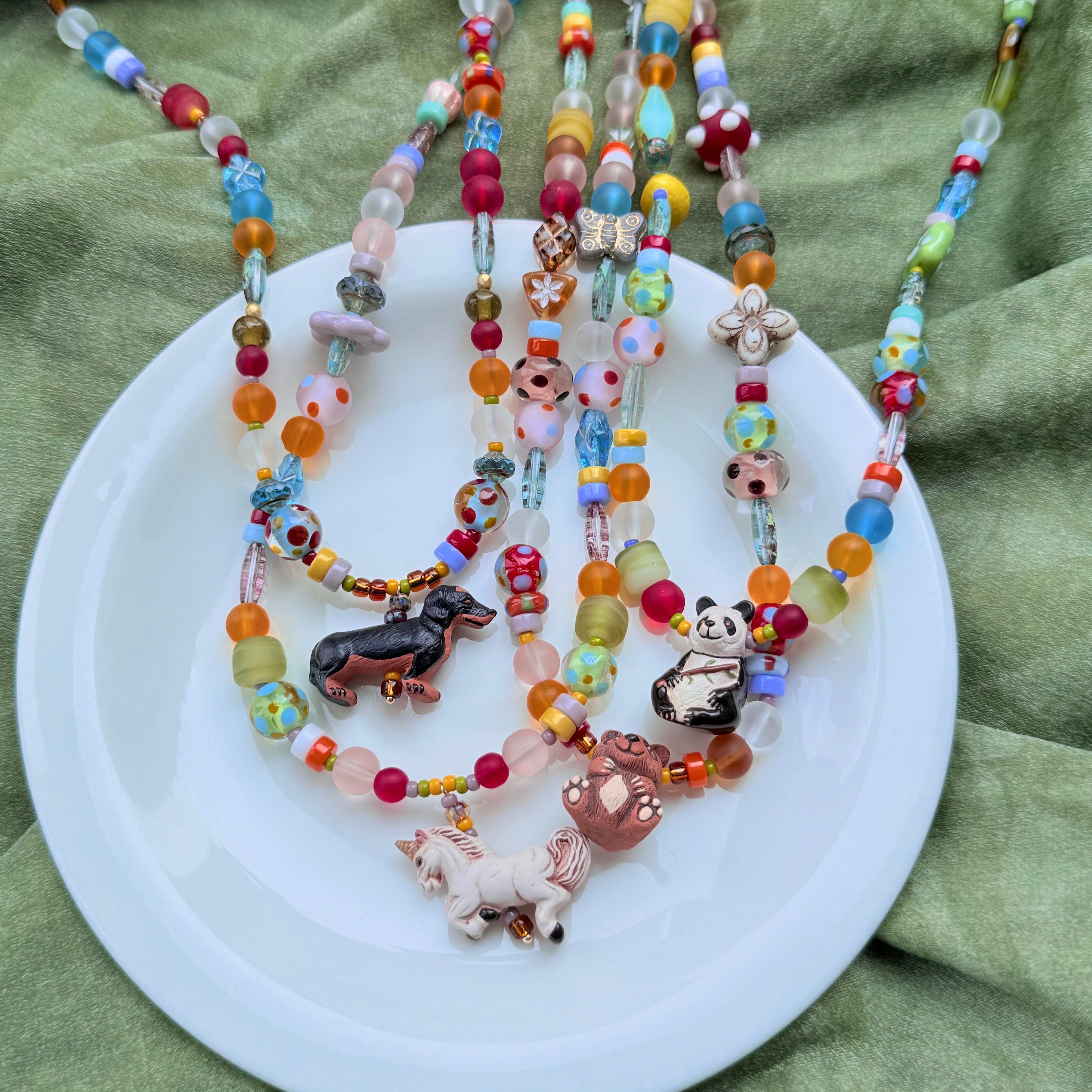 Each piece features an adorable hand-painted animal—like a clever lion, a cute panda, or a gentle cat—nestled among colorful, tactile glass beads. Every necklace, bracelet, or pair of earrings is a little story, full of movement, color, and fun.