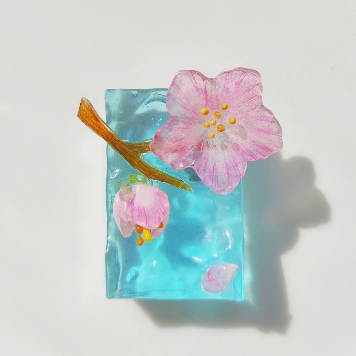 Each flower and petal is individually hand-painted and shaped using shrink film, then embedded in layered translucent blue resin. The result: a piece that looks like it was plucked from a dream and set in glass.